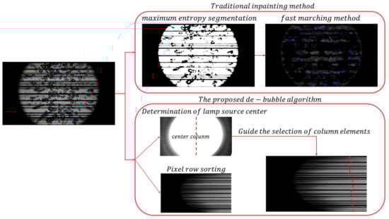 We also compared the proposed scheme with the traditional image inpainting algorithm based on the fast marching method (FMM) [27]. The basic idea of the traditional inpainting method is to get the mask of bubble region by maximum entropy segmentation [28], which represents the damaged area in the original image. Then the FMM algorithm is used to repair the image according to the mask so as to remove bubbles. The comparison between the FMM and our proposed de-bubble method is shown in Figure 11. Obviously, the maximum entropy segmentation cannot separate the correct mask for the fringe image with an especially complex background. In addition, the FMM algorithm needs to use the neighborhood pixels of masks, which will cause inter symbol interference (ISI) in the process of decoding.