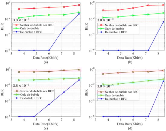 Furthermore, the BER performance at various rates when the air pump moved and dense bubbles were generated is shown in Figure 13. Due to the movement of the bubbles, the focus of the camera changed occasionally and the BER fluctuated slightly. However, each frame could still be regarded as the situation when the air pump was fixed. It is obvious that the proposed de-bubble algorithm can significantly increase the transmission data rate and provide robust transmission even in a harsh underwater bubble situation.