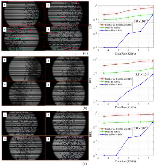 In order to verify the effectiveness of the proposed de-bubble algorithm, we tested the effect of bubble removal in four different bubble environments with a data rate of 7.2 Kbit/s, as shown in Figure 10. The results show that the proposed de-bubble algorithm based on sorting could effectively deal with bubbles in various situations, and the processing results were not affected by bubble densities, sizes, or distances. This is mainly because the multi-dimensional effects of bubbles on optical signals (such as reflection, refraction, scattering, and backscattering) can be reflected into one-dimensional pixels in the RSE-based UOCC system.