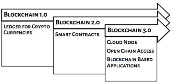 Bblockchain technology has developed and drastically evolved, and its evolution can be divided into stages as depicted in Figure 1 below. The first stage of the development is called as Blockchain 1.0, which consists of the public ledger for holding the cryptocurrencies over the distributed network. The next stage is Blockchain 2.0, which includes the trust management feature using smart contracts that manages itself with no involvement of any third parties. The third stage is Blockchain 3.0, which is the present and future of the technology and includes various application areas such as DeFe (decentralised finance), IoT, education, identity management, big data, Artificial Intelligence and healthcare, etc. [36].