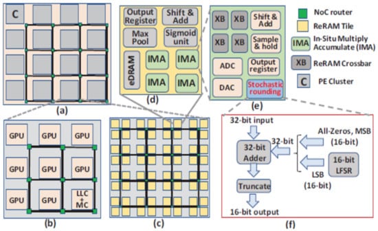 Proposed GRAMARCH architecture [15]. (Reprinted with permission from ref. [15]. Copyright 2021 IEEE). (a) Top view of proposed architecture, (b) Lower logic layer, (c) Upper ReRAM layer, (d) ReRAM tile, (e) In-situ Multiply Accumulate (IMA) and (f) Stochastic rounding implementation.