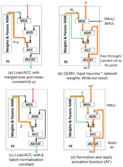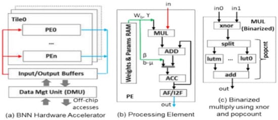 The authors in [24] proposed a BNN hardware accelerator design. Figure 3 shows their proposed BNN accelerator design. The architecture consists of many PEs (processing elements) which can be increased or decreased. The architecture can be scaled by adding more PEs. The proposed accelerator approach supports the hardware operations to perform the computations for the BNNs. Figure 4 illustrates the sequences of operations that a processing element takes to process a BNN layer. Their architecture was implemented on Aria 10 FPGA and their experimental results showed that the FPGA BNN implementation gave higher performance efficiency over the CPU (Xeon server) and GPU implementations (Titan X and TX1).