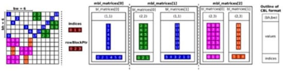The authors in [63] proposed a generic sparsity pattern termed Regularized Multi Block (RMB) sparsity pattern, an efficient storage format (CRMB), and a fast GPU algorithm for processing the RMBMM (SDMM with the multiplicand having the RMB sparsity pattern). Figure 9 shows the CRMB storage format for storing an RMB sparse matric. Their work showed that the RMB sparsity pattern enabled efficient implementations for parallel algorithms and a reduction in storage for a sparse matrix.