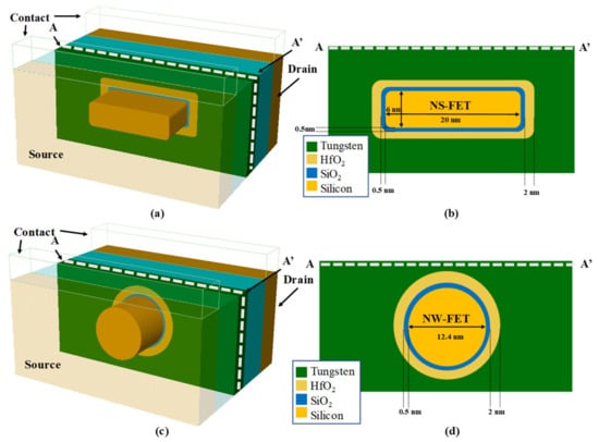 The structures of NS-FET and NW-FET designed by TCAD: (a) NS-FET 3D structure; (b) the cross section of NS-FET; (c) NW-FET 3D structure; (d) the cross section of NW-FET.