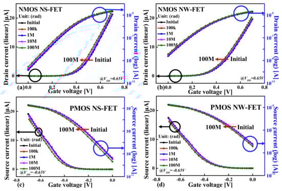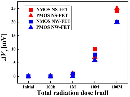 Figure 4 shows the shifted VT according to each total dose rate. It has been already known that the VT shifts of PMOS is larger than that of NMOS in planar MOSFET because the gate length is long, and there are many places where trapping can occur in the inter-face [16,17]. In contrast, the GAA structure has a much shorter channel length and supe-rior gate controllability, with less variation occurring because of TID effects.