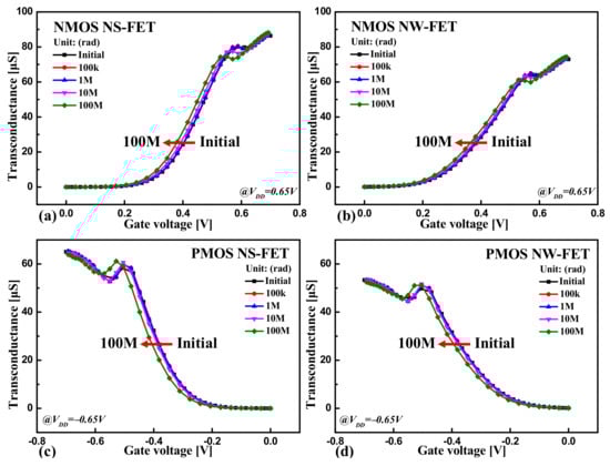 TID simulation transconductance curve of each device: (a) NMOS NS-FET; (b) NMOS NW-FET; (c) PMOS NS-FET; (d) PMOS NW-FET.