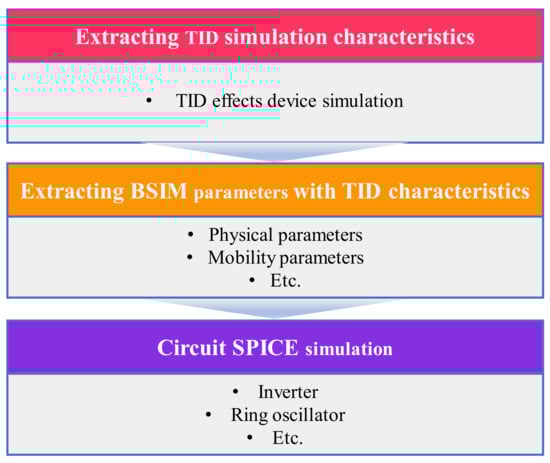 Figure 5 shows a flow chart of compact modeling considered with TID effects. First, the characteristics of the TID effect simulation data from the TCAD simulation were used for compact modeling. It is similar to an irradiation source, TCAD designs, etc. Next, the BSIM–CMG model parameters with TID effect characteristics were extracted, and the ID–VG curve was adjusted between the TCAD simulation data and BSIM–CMG data. The extracted BSIM model parameters include the physical parameters (structure, doping, material, channel length, etc.), linear region fitting parameters (mobility, series resistance, etc.), SCE parameters (drain-induced barrier lowering parameter, gate-induced drain leakage parameter, etc.), temperature, output conductance, etc. With BSIM model parameters and adjusted data with simulation results, a SPICE circuit simulation can be initiated with a circuit netlist.