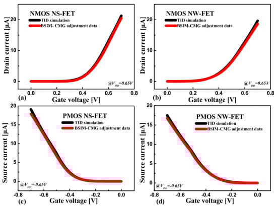ID–VG curve adjustment between TCAD simulation data and BSIM–CMG model parameter data: all curves are nonirradiated device simulation ID–VG curves: (a) NMOS NS-FET; (b) NMOS NW-FET; (c) PMOS NS-FET; (d) PMOS NW-FET.