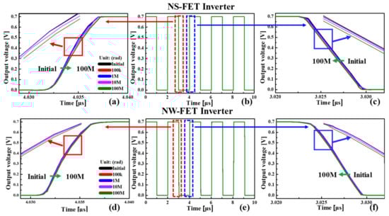 NS-FET and NW-FET inverter operation graph reflecting radiation accumulation: (a) NS-FET inverter rising edge; (b) inverter output pulse; (c) NS-FET inverter falling edge; (d) NW-FET inverter rising edge; (e) inverter output pulse; (f) inverter falling edge; (a,d) magnified region was at 4.034–4.036 μs; (c,f) magnified region was at 3.024–3.026 μs.