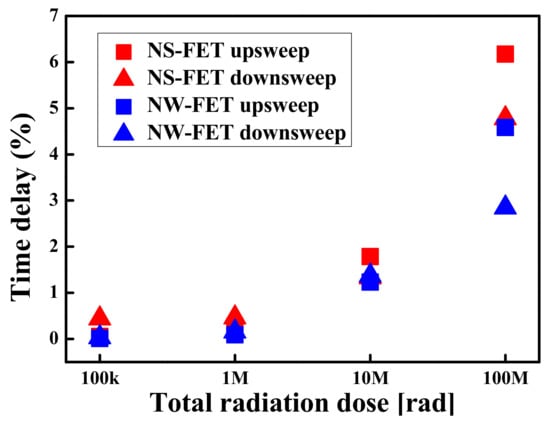 Figure 8 shows the time delay as a percentage of the inverter operation of NS-FET and NW-FET. The ratio was calculated by extracting the time delay between the device not affected by radiation and the device to be affected at output voltage 0.35 V and dividing it by 10–90% rise time (70 mV–0.63 V) of the device not affected by radiation. Both upsweep and downsweep showed that the delay of the NS-FET was more severe.