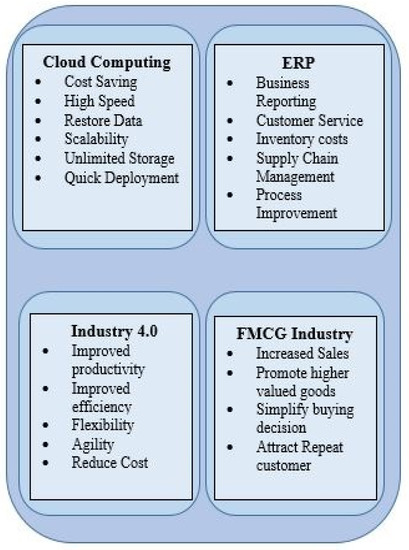 Based on the structure outlined in Figure 4, the main motive of this study is to highlight the benefits of combining cloud computing, ERP, Industry 4.0 and the FMCG industry. In the subsequent Section 2.1.1, Section 2.1.2, Section 2.1.3, Section 2.1.4, Section 2.1.5, Section 2.1.6, Section 2.1.7 and Section 2.1.8 the key aspects of the cloud paradigm shift, ERP and Industry 4.0 has been thoroughly discussed in terms of several aspects such as cloud ERP service deployment models, opportunities and concerns, and cloud ERP in the consumer goods industry along with a smart manufacturing process in Industry 4.0. In the following sections, theories behind adoption factors for cloud computing along with popular adoption theories such as DOI and TOE have been discussed.