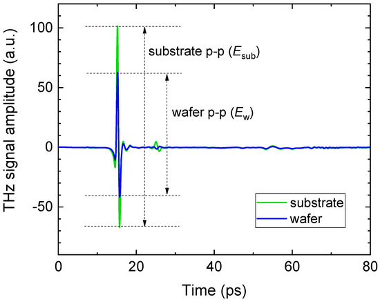 Time-domain traces through a bare substrate glass wafer and through a coated wafer, showing reduced transmission through the coated wafer and indicating the peak-to-peak values used in calculating frequency-averaged sheet resistance.
