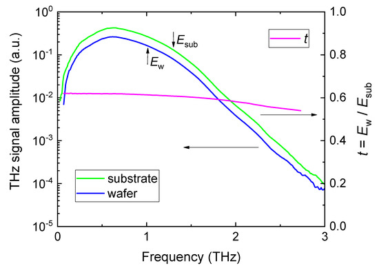 where Rs is sheet resistance, t is amplitude transmission, ns is the THz refractive index of the substrate material and Z0 = 376.7 Ω is the vacuum impedance. The amplitude transmission t is determined by measuring the THz field amplitude transmitted through a bare substrate (Esub) and through the coated test wafer (Ew) and calculating their ratio: t = Ew/Esub.