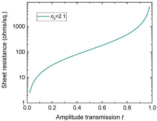 Dependence of calculated sheet resistance on the amplitude transmission t, assuming substrate refractive index of 2.1, as given by Equation (4).