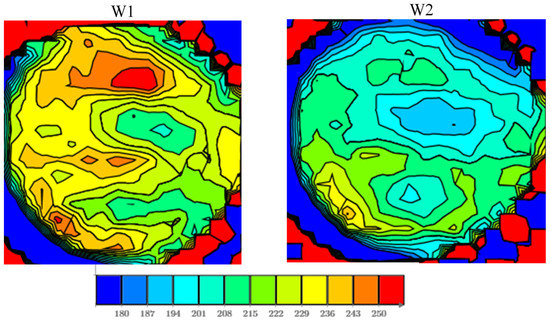 Sheet resistance contour maps for two 200 mm diameter wafers. W1: Mean value 223.2 Ω, standard deviation ± 19.9 Ω. W2: Mean value 202.1 Ω, standard deviation ±15.1 Ω.