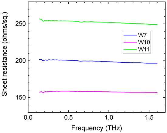 The application of Equation (4) requires knowledge of the refractive index of the substrate material. In our study, it was measured using THz TDS and is shown in Figure 5. A value of 2.1 was employed in frequency-averaged measurements since >96% of beam power is carried at frequencies below 1.5 THz. A frequency-dependent refractive index was used for calculating frequency-resolved sheet resistance.
