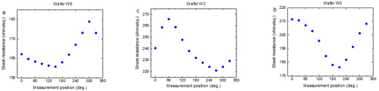 Figure 9 presents three examples of variation in sheet resistance measured around the circumference of wafers 25 mm from the edge. As with MW measurements, sheet resistance is seen to vary by up to 20%, in an irregular pattern that is different in every wafer. Notably, in most wafers examined, the difference between minimum and maximum sheet resistance values is larger where the mean sheet resistance is higher.