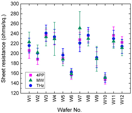 Mean sheet resistance of 12 wafers measured using the four-point probe (4pp), microwave resonator and THz time-domain spectroscopy. Each wafer was measured at multiple locations; the data points are the mean and standard deviation of all measured values.