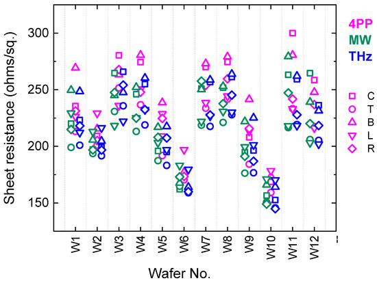 However, it must be noted that the number of measurements per wafer and their locations were different for each measurement technique. As seen in Figure 7 and Figure 9, the sheet resistance of a wafer varies significantly and irregularly over its area. Therefore, selecting different measurement locations may affect the mean sheet resistance observed and its standard deviation.