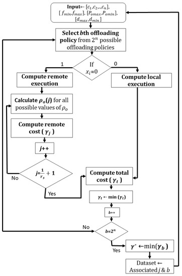 Figure 2 shows the flowchart of DNN [21]. As depicted in the figure, for a specific task size, our proposed algorithm selects either the local model or the remote model of execution, based on the offloading policy. In the case of the remote model, cost is calculated for all possible values of and then total cost for all components is calculated, incorporating both local and remote models. Then, for offloading policies and n number of components, cost is calculated, and for the minimum cost, time allocation and offloading policy are stored as datasets for further training of DNN.