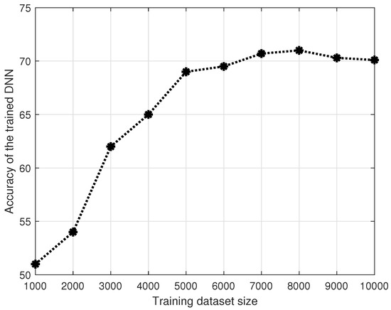 For different possible offloading policies with different data sizes, the minimum and maximum value for harvesting percentage time of a single time slot are observed to be 26.1 and 64 percent, respectively. For simulation, is selected as 0.001. There are 380 points between 0.261 and 0.64. Therefore, the output layer contains 380 neurons for and 3 neurons for offloading policy (total 383 neurons in the output layer). There are two hidden layers, each containing 100 neurons (through cross validation) and the Softmax activation function [22] is used to train the DNN. The accuracy of the network is calculated using the test dataset. The training function used is trainscg (scaled conjugate gradient backpropagation). The higher the number of neurons, the greater the complexity of the network. Similar is the case with the number of hidden layers, i.e., the higher the number of hidden layers, the greater the network complexity, but using two hidden layers in our dataset provided the maximum accuracy. In considering DNN, we have 10 datasets of samples from 1000 to 10,000 by calculating data via state variables. We measured the cost for all possible combinations of data to obtain the minimal cost. The trained network was then tested for the discrete 15 percent data. The MATLAB toolbox “nprtool” was used to solve the classification problem. The accuracy of the DNN was plotted by increasing the size of the training dataset, as shown in Figure 3. The simulation parameters are given in Table 4.