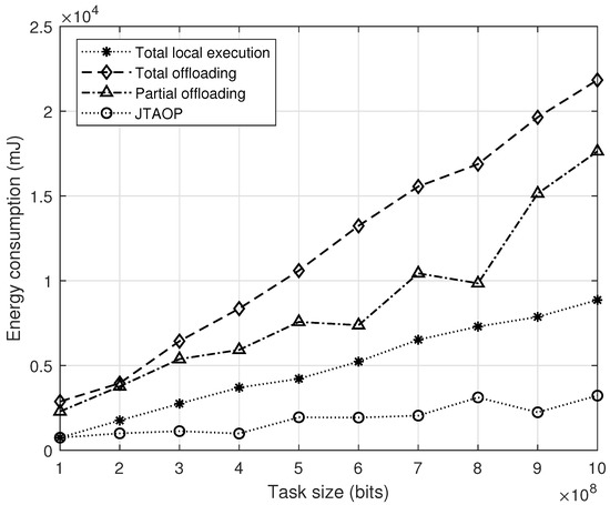In Figure 4, energy consumed by an MD is plotted verses varying task size. With the increasing task size, the energy consumption of all the methods increases. This is because a task size of 1 gigabit requires more energy for its completion than that of 0.1 gigabit. However, as is evident from the figure, in case of our JTAOP algorithm, the minimum amount of energy is consumed by the MD, making it the most efficient method. This is because JTAOP considers the optimal offloading policy for energy harvesting and offloading, emphasizing minimum energy expenditure. The maximum energy is consumed in the case of total offloading as all the components of the task are offloaded to MES, which leads to significant energy expenditure, followed by partial offloading and then total local execution.