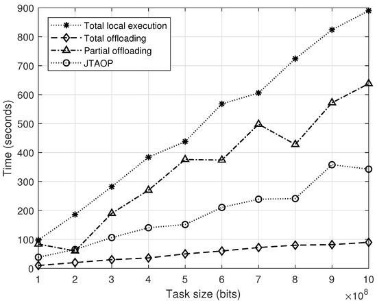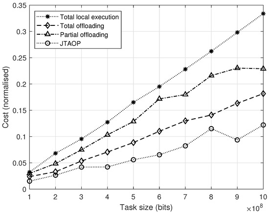 Figure 5 explains the relation of cost with the increasing task size. An increasing task size leads to an increasing trend of cost as more energy and time is required for the completion of a large task size. As depicted in the figure, our JTAOP algorithm results in minimum cost, which shows its effectiveness. This minimum cost is due to the joint consideration of time delay and energy consumption of MD in the cost function. While energy conservation is second best in the case of total local execution, nonetheless, maximum cost is observed in that case, as MD takes a lot of time, leading to high computational delay in local execution, rendering it inefficient.