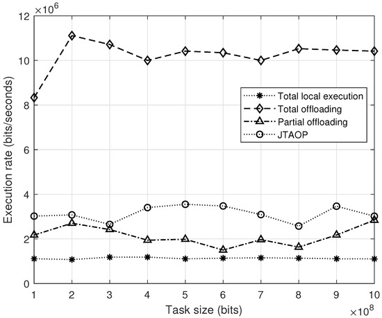 Figure 6 gives the relationship of execution rate with increasing task size. While the maximum execution rate can be observed in the case of total offloading because of the powerful execution power available at MES, it is at the expense of energy consumption and cost. Increasing the execution rate directly affects the energy consumption and cost of a scheme, which shows the trade-off between the energy consumed by an MD and the execution rate. This trade-off is observed in JTAOP where the optimal policy is selected for the maximum execution rate with the minimum energy consumed by the MD. The JTAOP algorithm not only demonstrates minimum energy consumption performance and minimum cost, but also shows a satisfactory performance in terms of execution rate.