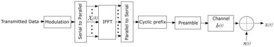 where i corresponds to the respective OFDM symbol, denotes the total number of OFDM symbols, k is the corresponding subcarrier, and M represents the total number of subcarriers. Furthermore, represents the transmitted signal that is obtained after the modulation in the transmitter block diagram, is the received signal after the FFT module at the receiver side, is the Channel Frequency Response (CFR), and is the Additive White Gaussian Noise (AWGN).