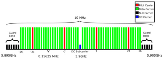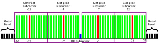 Based on [6], Figure 3 depicts the subcarrier distribution of the IEEE 802.11p standard. As mentioned previously, the bandwidth of the OFDM signal is given by 10 MHz and the radio frequency matches to 5.9 GHz. The data subcarriers are shown in green, while the pilots are shown in red and are uniformly distributed between the data subcarriers. Additionally, the null and Direct Current (DC) subcarriers are represented by black and blue colors, respectively. For the sake of simplicity, in our work, null and DC subcarriers are discarded.