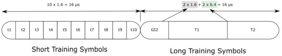 In Figure 4, the IEEE 802.11p packet preamble structure is illustrated. It can be seen that the preamble has 10 short training symbols of µs located at the beginning of the packet. These symbols are used to perform fine synchronization. In this work, the use of these symbols is discarded, since we assume a perfect synchronization to focus on the estimation/equalization issue. Furthermore, two long training symbols of µs can be distinguished, which are used to perform the channel estimation. Since these symbols are found for each subcarrier of the OFDM signal, they are better suited to calculating the channel estimation than the pilot signals [7]. Note that a guard interval to avoid out-of-band interference also exists, whose duration is µs.