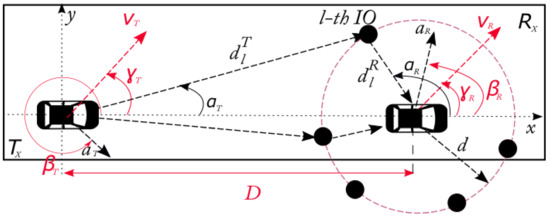 where are the distances of the transmitter and the receiver to the , c is the speed of light, whereas and are the velocity vector angles of the transmitter and receiver velocity vector, respectively. At the same time, and are the acceleration vector angles of the transmitter and receiver, respectively. Finally, and characterize the maximum Doppler shift caused by the velocity and acceleration of the mobiles, respectively, where stands for the wavelength of the transmitted signal and P must be replaced by R or T, which describes the receptor or the transmitter, respectively [6,17].