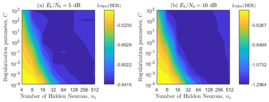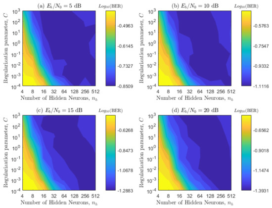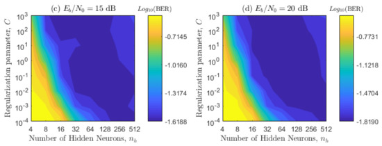 The proposed scheme has several parameters that need to be optimized, and some of these parameters have a correlation between them, so they need to be optimized together. Throughout the paper, we adopt the sigmoid mapping function, since it has reported an excellent generalization ability [18,22]. We initially optimized the regularization parameter C and the number of hidden neurons , by considering and . This means that the first optimization is basically the same for a supervised ELM. To select the best parameters, we use contour plots, which are obtained for four values: 5, 10, 15, and 20 dB for the two channel configurations presented in Table 2. In Figure 8 and Figure 9, each point of the contour plot corresponds to the representative BER value obtained by following the Monte Carlo simulation explained at the beginning of this Section. Then, to select the sub-optimal values of the regularization parameter and number of hidden neurons that minimize the system performance, we use visual inspection. Namely, the areas with the best performance (blue zones) and overlap among most of the figures are chosen. All sub-figures in Figure 8 and Figure 9 are considered in order to obtain a BER invariant to the movement angles, acceleration angles, and velocities of the transmitter and receiver. As expected, these plots also verify that the BER decreases as the relationship increases.