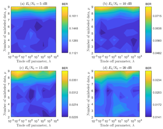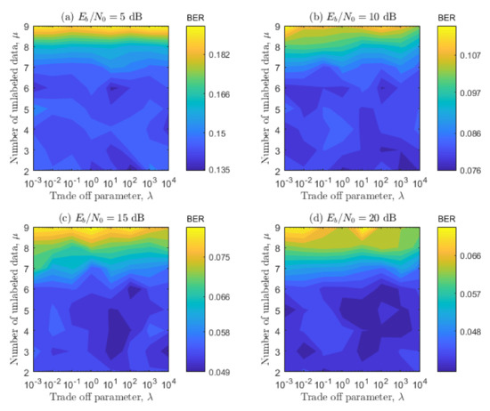 Once the values of C and were optimized, we proceed to optimize the parameters and simultaneously for the SS-ELM training/testing, in the same way as the previous ones for the standard ELM. Remember that represents the trade-off parameter between the supervised and no-supervised learning and proportionally represents the number of unlabeled samples; refer to the end of Section 3. Note that, for these results, we use a linear representation of the BER instead of a logarithmic one because the results are closer to each other and the resulting areas are smaller. Looking at the results of Figure 10 and Figure 11, it can bee seen that the optimal areas are relatively smaller when compared with the ones shown in Figure 8 and Figure 9. This means that there is a smaller range of values that can be used without compromising the BER performance. Furthermore, the values obtained are more sensitive to different channel configurations. It can also be seen in Figure 10 and Figure 11 that, when the value of the parameter is higher than 7, the system performs poorly. This result indicates that the proposed SS-ELM algorithm suffers over-fitting, or that there is too much noise added to the training process with the unlabeled data inclusion. When considering the parameter , it can be seen that the better values tend to be bigger than for the first configuration, and bigger than for the second configuration. This behavior means that SS-ELM benefits from bigger values of , meaning that the non-labeled data have a big impact on a one-to-one comparison with the labeled data. Then, the selected parameters are and , because this combination shows the best overall results for the simulated configurations. Finally, considering that the total value of unlabeled data used to train each data frame is times times 4, the total value used is 3072 symbols; when we compare this number with the total number of labeled data available for the training (616 symbols), we can observe that we use approximately five times more unlabeled data than labeled data for the training procedure. Hence, we take advantage of the semi-supervised paradigm, where we have few labeled data and plenty of unlabeled data. Transforming this to the studied communication scenario, we have only four pilot subcarriers to equalize 52 data subcarriers, but we use unlabeled data to improve the performance.