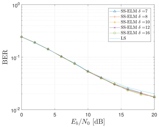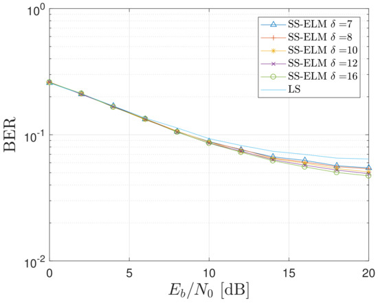 In this Subsection, we analyze the results of the proposed SS-ELM for different values of the parameter. As mentioned in Section 3, the parameter is oriented to decrease the time-variant channel effects in the system performance. To this end, it relates to the number of pilot subcarriers employed in the learning phase of each time slot.