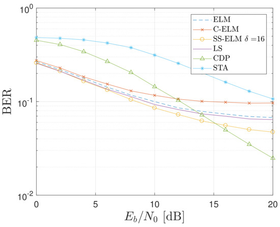 In Figure 12 and Figure 13, it can be seen the BER resulted from the SS-ELM scheme against for diverse parameters by considering configurations 1 and 2, respectively. The LS results are also displayed as a reference BER curve. In the following Section, our proposal will be carefully compared with the bench-marking estimators/equalizers. There is a direct relation between the value of the parameter and the BE performance. We can also see that, for system configuration 1, there is a clear improvement, with values of near to 12; this enhancement is not present for configuration 2. Therefore, it is possible to say that the impact of the parameter in the performance of the systems is higher for a rougher system setting, such as the configuration 2. Finally, there is a clear performance improvement for the close interval between 7 and 12 of the parameter for both of the evaluated configurations. In conclusion, the best overall results are obtained with a SS-ELM characterized by , by relaxing the requirement with respect to the LS technique.