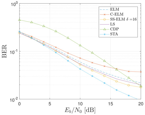 For the first and second configuration, Figure 14 and Figure 15 depict the BER as a function of for the different techniques evaluated. It can be seen that ELM, C-ELM, SS-ELM, and LS methods tend to have the same BER, regardless of the scenario. On the other hand, for the first and second configurations, the STA method has the worst and best BER values, respectively. The CDP method outperforms the other techniques for high SNRs only for the first configuration. These observations mean that STA and CDP do not perform uniformly for different channel configurations; consequently, these techniques are not feasible for V2V communications. Among the rest of the evaluated techniques, our proposal shows a uniform and slightly better performance for the evaluated scenarios, especially for higher SNRs. For instance, given a threshold of in the first configuration, the SS-ELM allows a greater than 8 dB. Meanwhile, the requirement corresponds to 9, 10, and 14 dB in the case where the LS, ELM, and C-ELM approaches are used, respectively. It is worth noting that observations for SNRs greater than 20 dB can be discarded, since these values rarely occur in real settings [28]. Furthermore, it is worth noting that the vehicular communication channel evaluated in this manuscript is extremely harsh; therefore, none of the evaluated schemes achieved the BER threshold given by the standard and equal to [30,31].