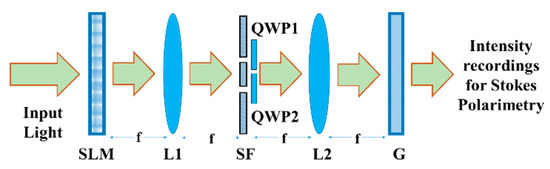 Different approaches and optical setups have been reported, which can be employed to generate a vector field, as described in Equation (3) [46,47]. The methods use spatial light modulators (SLMs) for encoding the PPDs into the orthogonal components of light through computer-generated holograms (CGHs). A single SLM-based optical setup can be utilized for implementing the proposed scheme. The schematic diagram of the setup is shown in Figure 3. In this case, the CGHs encoded onto the SLM consist of 2D holographic grating, a combination of two one-dimensional gratings aligned along x- and y-directions and each with their own phase distribution, namely φ1(x,y) and φ2(x,y), respectively. When linearly polarized light passes through the SLM and proceeds through a converging lens, diffraction orders are obtained. The first diffracted order (+1) generated along the x- and y-directions is isolated using the spatial filter and then passed through a quarter-wave plate to convert these two diffraction beams into right and left-hand circular polarization. Another grating can be used such that both these diffraction orders overlap and stay overlapped beyond that. The resultant is the vector field as illustrated in Equation (3). Stokes parameters can be evaluated by recording the intensity distributions of the resulting field to obtain the ciphertext.