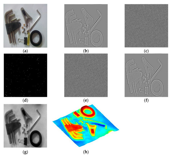Results for a 2D image. (a) A picture of some lab components, (b) one of the two digitally propagated defocused intensities, (c) one of the scrambled images of the defocus intensities, (d) ciphertext, (e) key, (f) decrypted defocused intensity, (g) retrieved phase map, and (h) surface plot of the phase map.