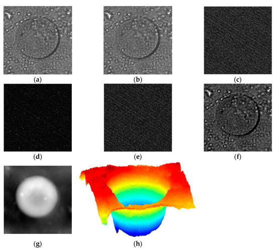 In the second case, the phase distribution of the micro-lens has been used as plaintext. The intensity distribution of the micro-lens has been captured through a TIE-based setup, as discussed in Section 4.1. The captured intensity distributions I1(x,y) and I2(x,y) are shown in Figure 5a,b, respectively. Afterwards, numerical simulation has been performed similarly to the previous case. The encryption has been performed as discussed through SVP encoding. The corresponding vector field is obtained using Equation (3), and the ciphertext C(x,y) and key K(x,y) are obtained using Stokes polarimetry, as illustrated in Equations (4) and (5). The ciphertext and key, in this case, have been shown in Figure 5d,e, respectively. The decryption is performed as described by using the correct key and the ciphertext. The decrypted phase distribution is shown in Figure 5g, and the corresponding 3D plot is shown in Figure 5h.