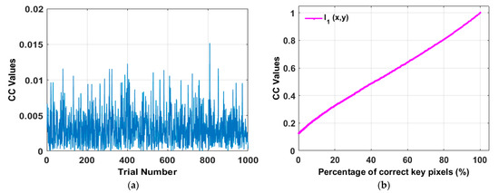 The security analysis of any proposed encryption scheme is very important, which has been discussed in this section. The immunity of a cryptosystem against attacks reflects the strength of the system. The brute force attack is one such widely used attack that is based on a random key search. If N × N is the number of pixels of a key and M is the possible value of each pixel, the number of trials to retrieve the key will be MN×N [3]. The number of trials further increases with the size of the used key. To substantiate this, we assume that the attacker has ciphertext as well as a priori information about the encryption algorithm. The attacker assumes random distributions as the key and then tries to decrypt the ciphertext with the assumed key and the known algorithm. For quantifying the decryption quality, the correlation coefficient (CC) of the decrypted image (using brute force) with the plaintext for each trial is evaluated. The decryption has been carried out using randomly generated keys. The plot of CC versus the number of trials for micro-lens is shown in Figure 6a. It can be seen that decryption remains unsuccessful even after 1000 decryption trials, and for all trials, the CC value remains below 0.02. Hence, it can be concluded that the attacker cannot retrieve the plaintext even after a large number of trials. It is also important to note that a known-plaintext attack does not apply to such a cryptosystem [12].