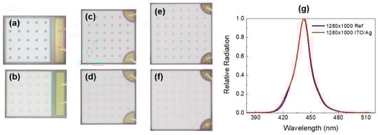 Optical microscope images of three different-size VLEDs (chip sizes of (a,b) 1280 × 1000 µm2, (c,d) 1400 × 1400 µm2, and (e,f) 1700 × 1700 µm2) with (a,c,e) reference and (b,d,f) ITO/Ag electrodes. (g) EL spectra of the VLEDs (1280 × 1000 µm2) with reference and ITO/Ag n-contact.