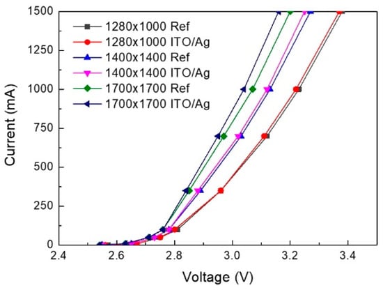 Figure 2 presents the I-V properties of fully packaged VLEDs as functions of n-contact schemes and chip size. It is shown that the forward voltage of the samples decreases with increasing chip size. For the reference samples, the forward voltage decreases from 3.38 to 3.20 V at 1500 mA, while the voltage of the ITO/Ag-based samples changes from 3.37 to 3.15 V. In addition, both the samples with reference and ITO/Ag contacts (1280 × 1000 µm2) showed the same series resistance of 2.3 Ω (below 100 mA). It is noted that regardless of chip size, the ITO/Ag-based samples produce forward voltages similar to the reference. This may be explained as follows. ITO is deposited by means of sputtering whose plasma process may damage the n-GaN, resulting in the generation of N vacancy and the effective removal of native oxide. This could improve the electrical property of n-type ohmic contact [,]. However, sputtering plasma could damage the electrical properties of p-GaN [,], resulting in an increase in the contact resistivity of p-type contacts and leading to high series resistance. Thus, the electrical property of p-type contacts dominates that of n-type contact and plays a dominant role in the forward voltages.