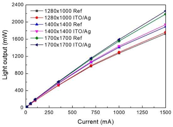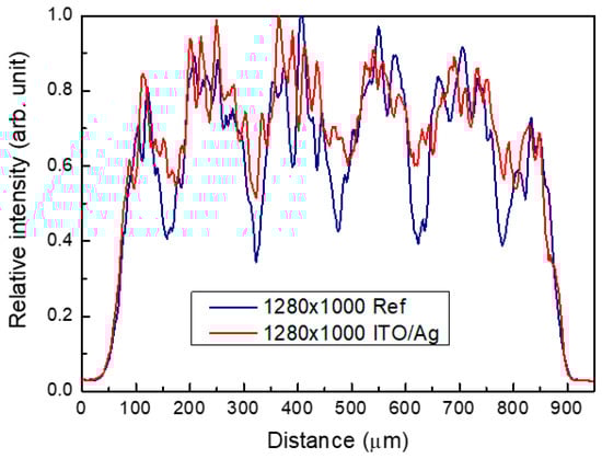 For thin film VLED structures, via holes for n-contacts are formed through the MQWs by dry etching, at which no photons are generated. The reference Ti/Al n-contacts having low reflectance absorb most of photons, whereas the ITO/Ag n-contacts effectively prevent the absorption of photons and could cause them to get extracted. Consequently, the n-contact regions appear dimmer than the surrounding area. Figure 5 shows plan-view light-emission and light intensity distribution images at 1.0 A obtained from the reference and ITO/Ag n-contact-based VLEDs (size: 1280 × 1000 µm2). As expected, the Ti/Al-based n-contacts appear darker than the ITO/Ag n-contacts, resulting in the non-uniformity of emission. This was further confirmed by line profiles, as illustrated in Figure 6, which were obtained from the regions (dotted squares) of the samples of Figure 5. The profiles show that the emission of the ITO/Ag n-contact regions is improved by 38.2% as compared with that of the reference (Ti/Al contact). So for the ITO/Ag-based sample, the ratio of the emission intensity of the active region (the surrounding area) and the contact areas is estimated to be 1.34. On the other hand, for the reference sample, the emission intensity ratio was 1.8. This indicates that the use of the ITO/Ag reflective n-contact effectively improves the emission uniformity. Here, the larger VLEDs (sizes: 1400 × 1400 µm2 and 1700 × 1700 µm2) are to show similar emission characteristics.