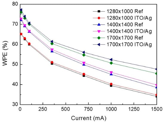 Figure 4 illustrates WPE of fully packaged VLEDs as functions of n-contact schemes and chip size. Regardless of n-contact schemes, the larger samples show higher WPE across the whole current range. Furthermore, irrespective of chip size, the WPE of all samples decreases with increasing current. However, the ITO/Ag-based samples undergo less degradation. For example, for the chip sizes of 1280 × 1000 µm2, 1400 × 1400 µm2, and 1700 × 1700 µm2, the ITO/Ag-based samples exhibit 2.3%, 3.1% and 4.8% higher WPE at 1500 mA than the reference samples, respectively. The WPE droop can be attributed to the combined effects of electron overflow, Auger recombination and Joule heating. It is shown that the overall current dependence is similar to that of light output power of the samples.