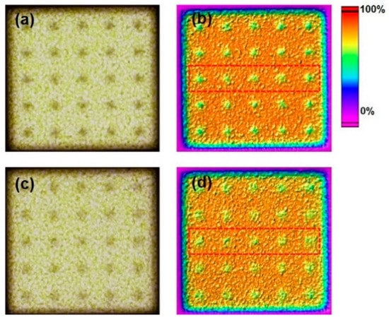 Plan-view (a,c) light-emission and (b,d) light intensity distribution images at 1.0 A which were obtained from (a,b) the reference and (c,d) ITO/Ag n-contact VLEDs (size: 1280 × 1000 µm2).
