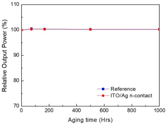 To examine the stability of packaged VLEDs with the ITO/Ag n-contact, the operation time dependence of the light output power was investigated. Figure 7 presents the light output power of fully packaged VLEDs (size: 1280 × 1000 µm2) with the reference and ITO/Ag-contacts as a function of operation time. The packaged samples that were attached to a heatsink were loaded into a chamber at 25 °C and stressed at current of 1.5 A. It is evidently shown that, like the reference sample, the ITO/Ag n-contact sample experiences no degradation after 1000 h. This implies that the ITO/Ag scheme can serve as a promising n-electrode for the fabrication of high-performance VLEDs for micro-LED-based display and vehicle headlamp applications.