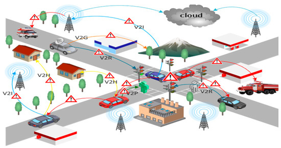 The emerging era of the Internet of Things (IoT) is transforming conventional Vehicular Ad-hoc Networks (VANET) into a new paradigm, named Internet of Vehicles (IoV) [1,2]. IoV plays a vital role in forming a dynamic network of connected vehicles for optimizing the main operations of an Intelligent Transport System (ITS) [3,4]. IoV enables efficient information sharing between vehicles as well as other network entities [5]. Figure 1 shows various communication types of IoV including V2V: Vehicle-to-Vehicle, V2R: Vehicle-to-Road, V2P: Vehicle to Pedestrian, V2I: Vehicle to Infrastructure, V2H: Vehicle to Home, and V2G: Vehicle to Grid or Vehicle to Green. The V2X has promising benefits in providing efficient and reliable bulky communications [6,7]. Thus, this makes IoV a key enabler of a wide range of unprecedented applications related to road safety, traffic management, and travel comfort [8]. In particular, IoV-enabled applications help avoid road accidents, detect less congested itineraries, and reduce air pollution and fuel consumption.