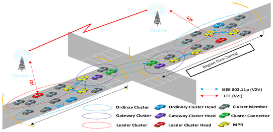 To overcome these issues, and to reduce the complexity of vehicle-to-everything (V2X) systems [16], one possible solution is to dynamically divide vehicles into clusters based on common attributes such as location, direction, speed, etc. [17,18,19]. In such clusters, the vehicles send messages only to the cluster head, to avoid the broadcast storm problem. The cluster head can then send these to other cluster heads or vehicle members.