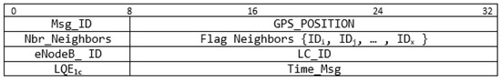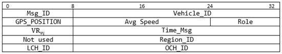 In the network initialization phase, when a vehicle decides to join the network it should turn on its communication system and update its state to an un-clustered node. Then, it should announce its existence to the neighboring vehicles. To do so, the new vehicle broadcasts a periodic “Hello message” to its one-hop neighbors, while simultaneously receiving similar messages from them. The periodic “hello message” contains the necessary information to perform the clustering process (see Figure 4). Firstly, all sending vehicles put their main information including position, role, and velocity into the “hello message”. At receiving a “hello message” from all its one-hop neighbors, each vehicle calculates its Reliability by using the formulas (Equations (10) and (11)) to switch to the cluster’s formation phase.